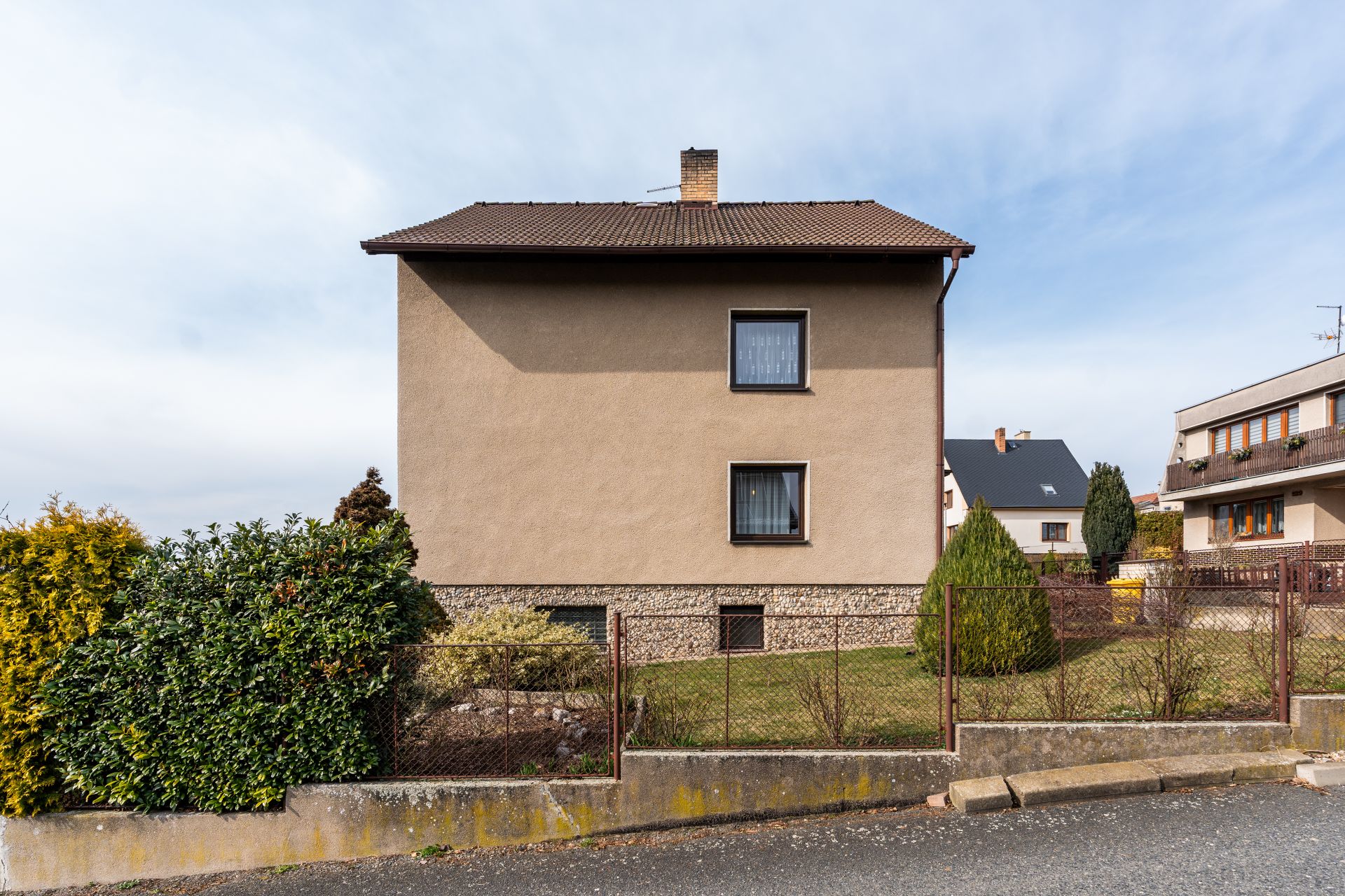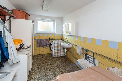Třípodlažní dům, zasazený do mírného svahu, efektivně využívá terén, což umožňuje přirozené prosvětlení suterénu o rozloze 70 m², který disponuje přímým vstupem na zahradu i do garáže o velikosti 17,5 m². Zde naleznete technickou místnost, dílnu, praktickou uhelny s promyšleným řešením zásobování, a především samostatnou garsonku s již připravenými vývody pro koupelnu a kuchyňský kout. Tato flexibilní část domu otevírá široké možnosti využití od vícegeneračního bydlení, přes domácí kancelář či podnikání z domova, až po pronájem nebo komfortní zázemí pro hosty. Díky svému částečnému vyvýšení nad terénem je tento prostor příjemně prosvětlen denním světlem.