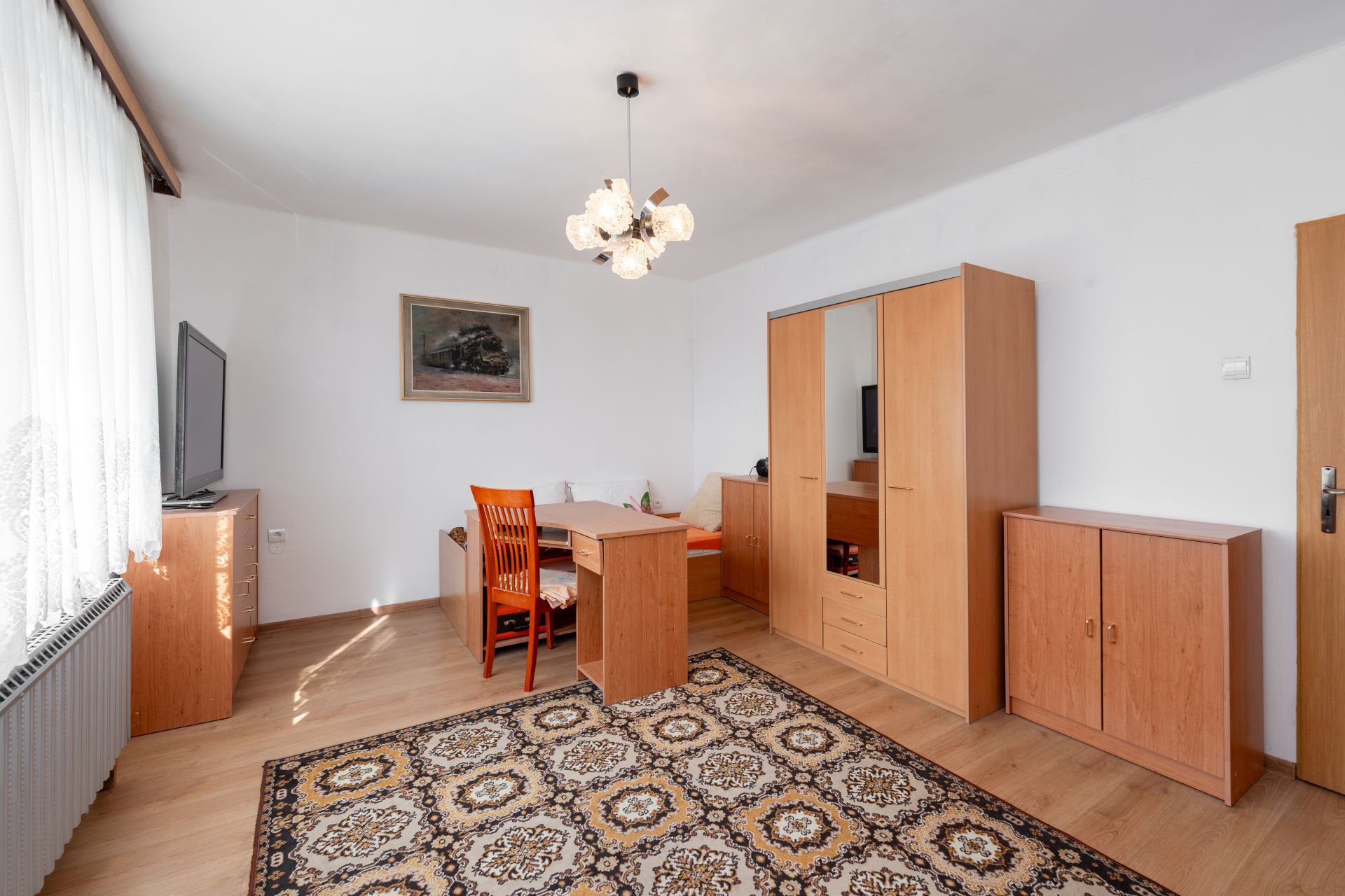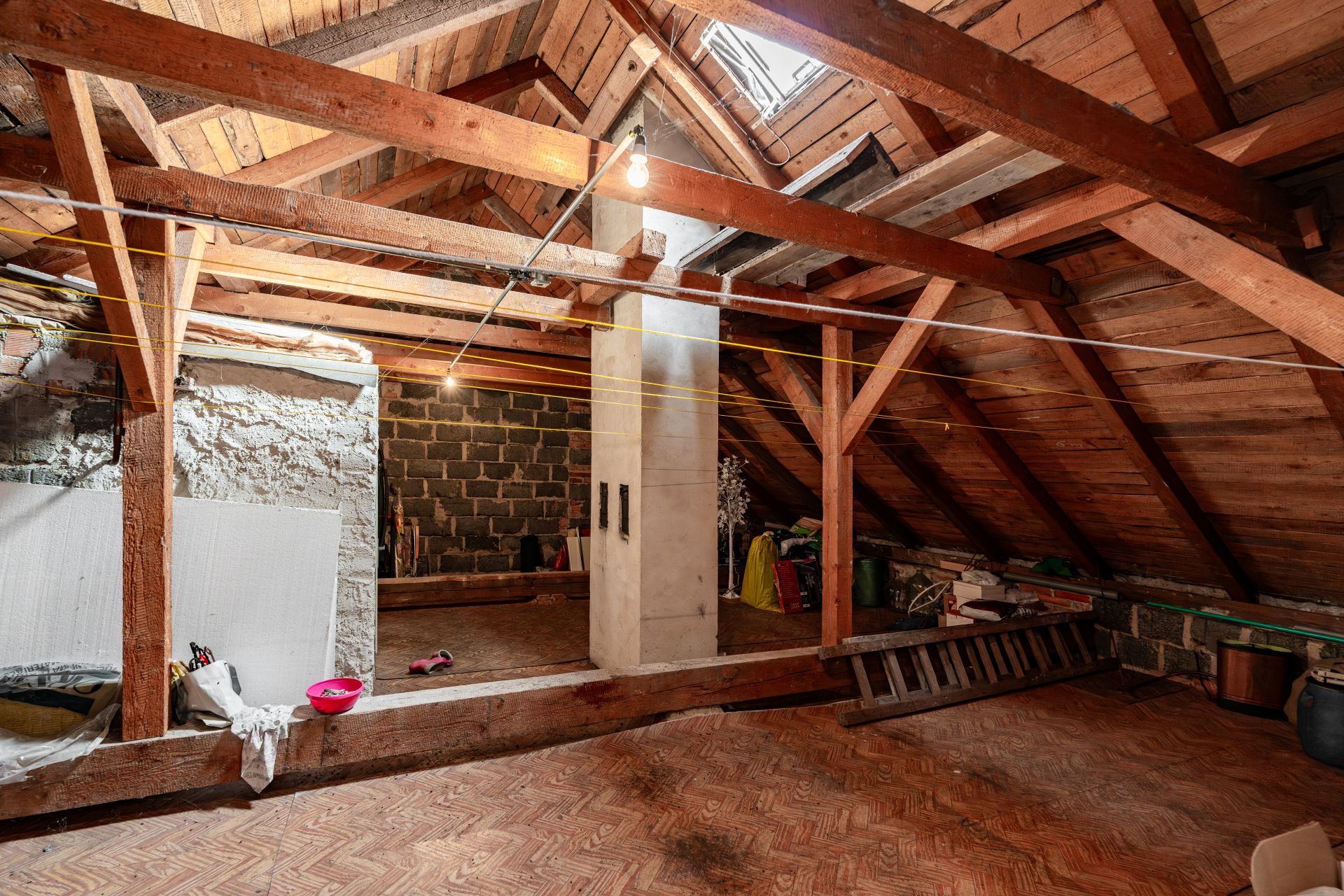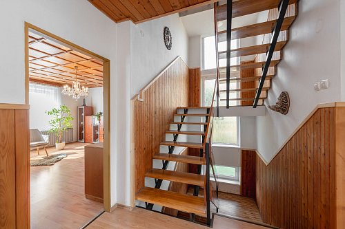 Z patra vede schodiště na pochozí půdu s arkýřovými okny, která dnes slouží jako praktický úložný prostor a sušárna. Tato část domu však představuje významný potenciál pro vestavbu dalších obytných místností, ať už pro pracovnu, hernu nebo pokoje pro hosty, což dále rozšiřuje užitnou plochu nemovitosti a přizpůsobuje ji rostoucím potřebám rodiny. Střecha prošla rekonstrukcí před třemi lety, s použitím kvalitních tašek Bramac, což garantuje dlouhodobou spolehlivost a minimální údržbu.